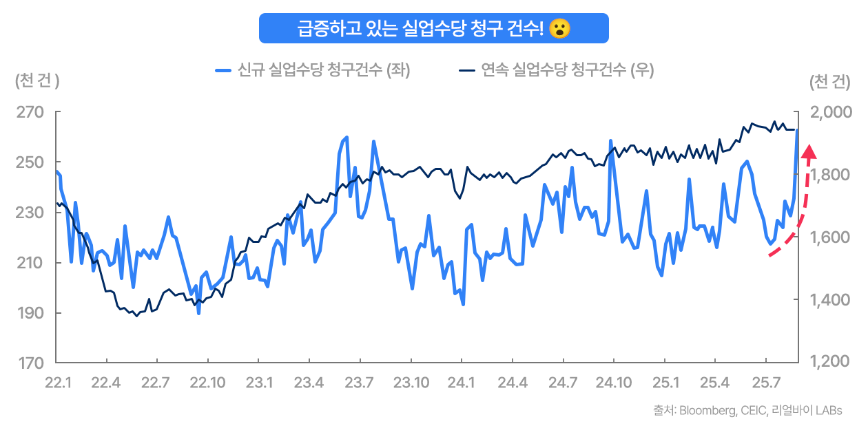 ๋ฏธ๊ตญ ์ฐ๋ฐฉ์ค๋น์ ๋(Fed)์ 9์ ๊ธ๋ฆฌ ์ธํ(0.25%p)๋ ์ด์ ์ฌ์ค์ ํ์ ์ ์ ๋๋ค. ์ฐ์ค์ ์ ์ฑ ์ ์ธ์ถ๊ฐ ์ธํ๋ ์ด์ ๋ฆฌ์คํฌ์์ ๊ณ ์ฉ ๋ฆฌ์คํฌ๋ก ์์ ํ ๊ธฐ์ธ์๊ธฐ ๋๋ฌธ์ ๋๋ค. ๊ณ ์ฉ ์์ฅ์ ์ ํ ์งํ์ธ ์ฃผ๊ฐ ์ ๊ท์ค์ ์๋น์ฒญ๊ตฌ๊ฑด์๊ฐ ์ง๋์ฃผ 26.3๋ง ๊ฑด์ ๊ธฐ๋กํ๋ฉฐ 2021๋ 10์ ์ดํ ์ต๊ณ ์น๋ฅผ ๊ฒฝ์ ํ์ต๋๋ค. ์ด๋ ๋ ธ๋์์ฅ์ด ์์๋ณด๋ค ๋น ๋ฅด๊ฒ ๋๊ฐ๋๊ณ ์์์ ์์ฌํฉ๋๋ค.