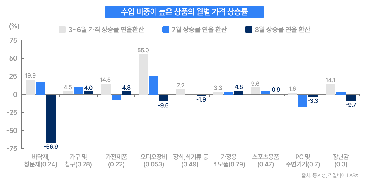 8์ ์ธํ๋ ์ด์ ์ ๊ฐ์ฅ ํฐ ํน์ง์ ๊ด์ธ๋ณด๋ค ์๋น์ค ๊ฐ๊ฒฉ์ด ์ฃผ๋ํ๋ค๋ ์ ์ ๋๋ค. ํญ๊ณต๋ฃ๊ฐ 7์์ ์ด์ด ๋ ๋ฌ ์ฐ์ ํฐ ํญ์ผ๋ก ์์นํ๊ณ , ์ฃผ๊ฑฐ๋น๋ ์ฌํด ๋ค์ด ๊ฐ์ฅ ํฐ ํญ์ผ๋ก ์ฌ๋ผ ์ ์ฒด ๋ฌผ๊ฐ ์์น์ ๊ฒฌ์ธํ์ต๋๋ค. ๋ฐ๋ฉด, ๊ด์ธ๋ก ์ธํ ์ธํ๋ ์ด์ ์ํฅ์ ๊ฐ์๋ก ํฌ๋ฏธํด์ง๊ณ ์์ต๋๋ค. ์์ ๋น์ค์ด ๋์ ์ํ ํญ๋ชฉ์ ์๊ฐ ๊ฐ๊ฒฉ ์์น๋ฅ ์ ์ง๋ 3~6์๋ณด๋ค ํ์ฐํ ๋จ์ด์ก์ต๋๋ค. ์ด๋ ๊ธฐ์ ์ ๊ฐ๊ฒฉ ์ ๊ฐ๋ ฅ์ด ์ฝํ๋๊ณ ์์์ ์์ฌํฉ๋๋ค.