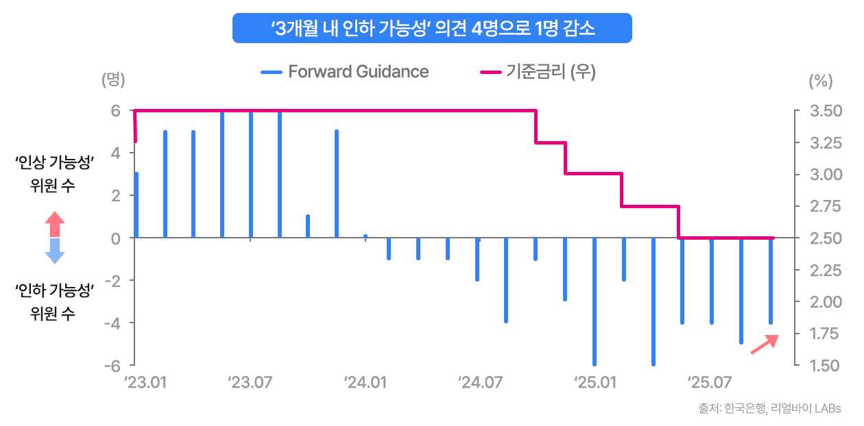 ๋๋ค. ํฅํ 3๊ฐ์ ๋ด ๊ธ๋ฆฌ ์ธํ ์ ๋ง์ ๋ํด ์ ์ฑํ ์์๋ง ์ ์ผํ๊ฒ ์ธํ๋ฅผ ์ฃผ์ฅ(2.5%โ2.25%)ํ๊ณ , ์ด์ฐฝ์ฉ ์ด์ฌ๋ฅผ ํฌํจํ ๋๋จธ์ง 6๋ช