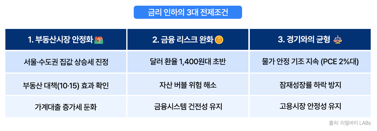 ํ๊ตญ์ํ์ด ์ฑํํ "์กฐ๊ฑด๋ถ ํฌ์๋ ๊ฐ์ด๋์ค(Conditional Forward Guidance)"๋ ๋ถ๋์ฐ ์์ ยท๊ธ์ต์์ฅ ๋ฆฌ์คํฌ ์ํยท๊ฒฝ๊ธฐ ํ๋ณต์ด๋ผ๋ 3๋ ์ ์ ์กฐ๊ฑด์ด ์ถฉ์กฑ๋ ๋๋ง ๊ธ๋ฆฌ ์ธํ๊ฐ ๊ฐ๋ฅํ๋ค๋ ์์น์ ์๋ฏธํฉ๋๋ค. ์ด๋ ํตํ์ ์ฑ